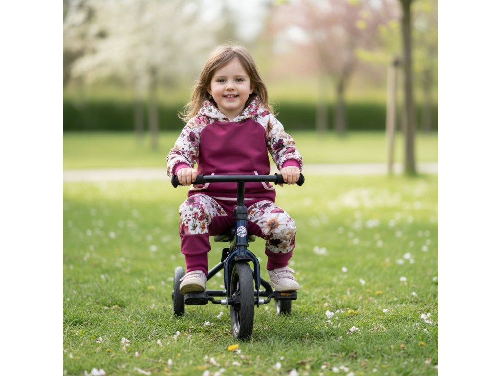 -kalhoty- vzor bude na kolenou, zbytek jednobarevný. Kalhoty mají v pase pružný náplet společně se šňůrkou a brzdičkou, díky které kalhoty nebudou padat a přizpůsobí se pasu dítěte. Nohavice jsou také zakončeny nápletem. Barva nápletu je vždy volena tak, aby ladila k celku.
